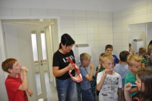 Um dies zu verhindern, muss man die Zähne gründlich putzen. Dies sollte immer nach der sog. KAI-Regel erfolgen: K steht für Kauflächen (zuerst oben, dann unten putzen), A für Außenflächen (Zähne aufeinanderbeißen und kreisförmig putzen) und I für Innenflächen (kreisend oder kehrend Zahn für Zahn vom Zahnfleisch weg nach außen putzen). Diese richtige Putztechnik erprobten sodann alle Kinder mit den beiden zahnmedizinischen Fachangestellten Alexandra Groß und Brigitte Leopold. Es stellte sich heraus, dass es viel Übung und auch Zeit bedarf, um in der richtigen Technik mit der Zahnbürste auch jeden Winkel zu erreichen.